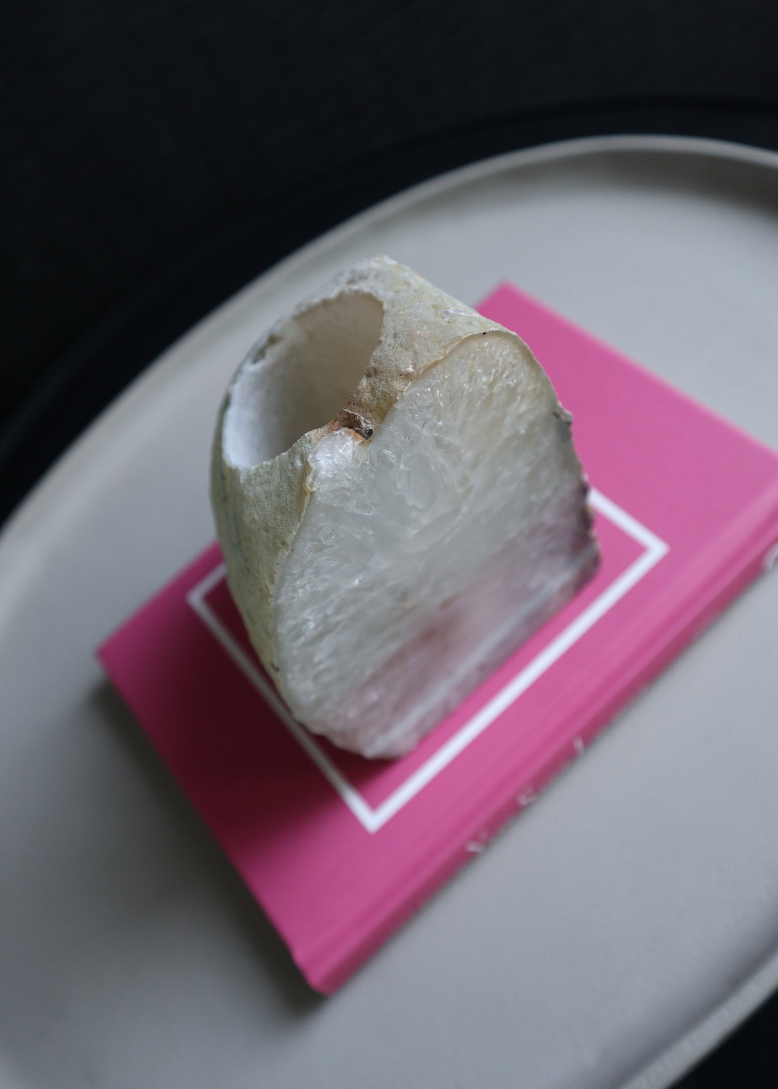 De waxinelichthouder van agaat is gemaakt van een halfedelsteen die bekendstaat om zijn bijzondere patronen en schitterende kleurschakeringen. Agaat behoort tot de kwartsgroep en ontstaat in gesteenten met natuurlijke scheuren of holtes, zoals vulkanisch gesteente en basalt.
