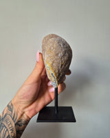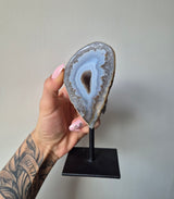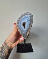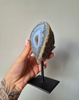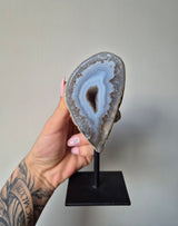 Agaat op standaard is een prachtig stukje natuur dat de aandacht trekt met zijn unieke schoonheid en veelzijdigheid. Agaat, een mineraal uit de kwartsfamilie, staat bekend om zijn kleurrijke banden en patronen, die variëren van zachte pasteltinten tot levendige en intense kleuren.