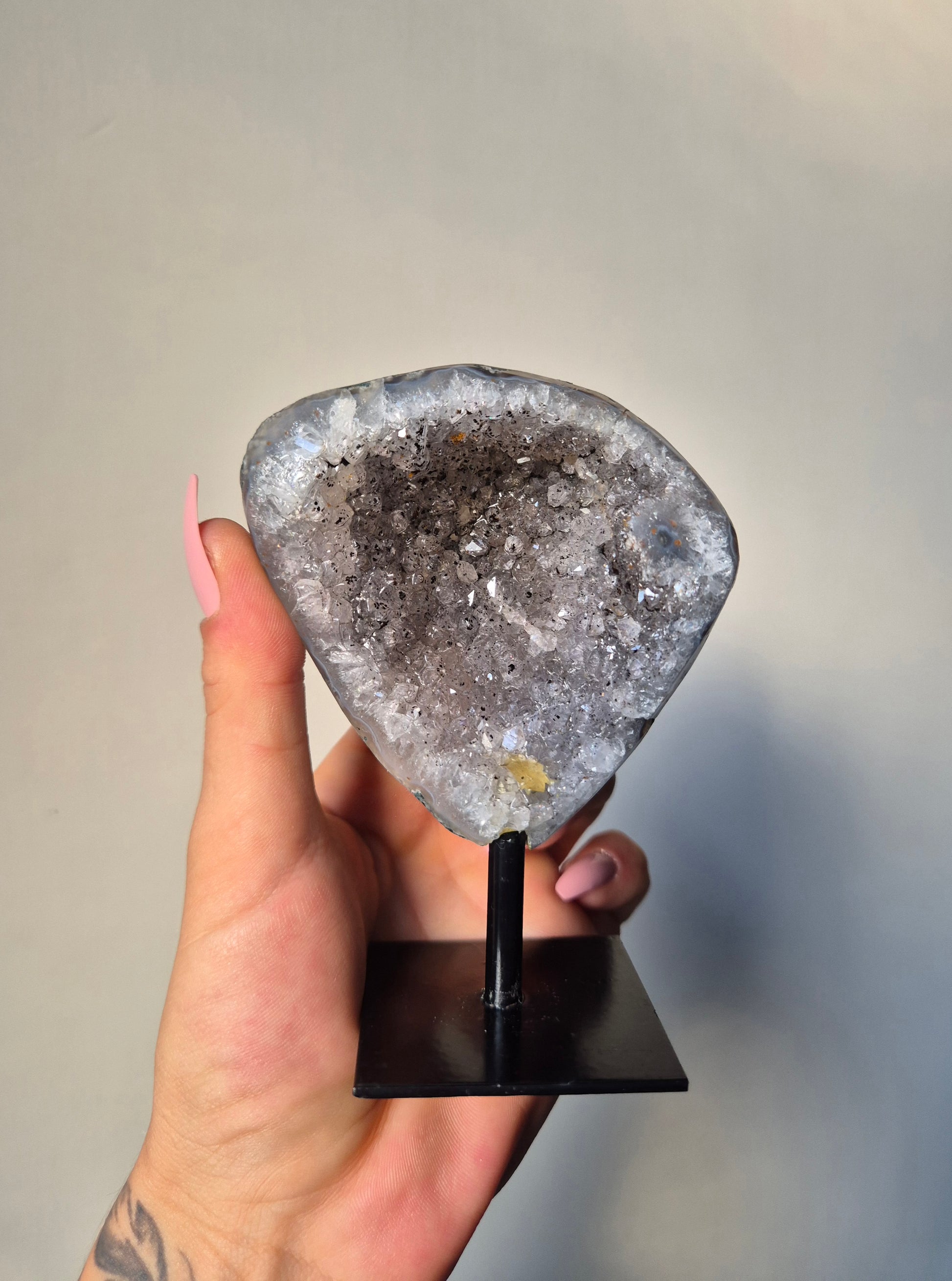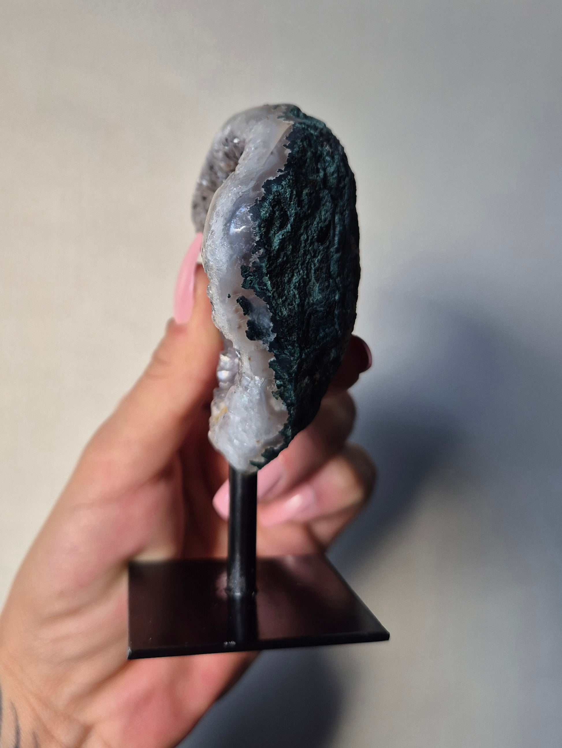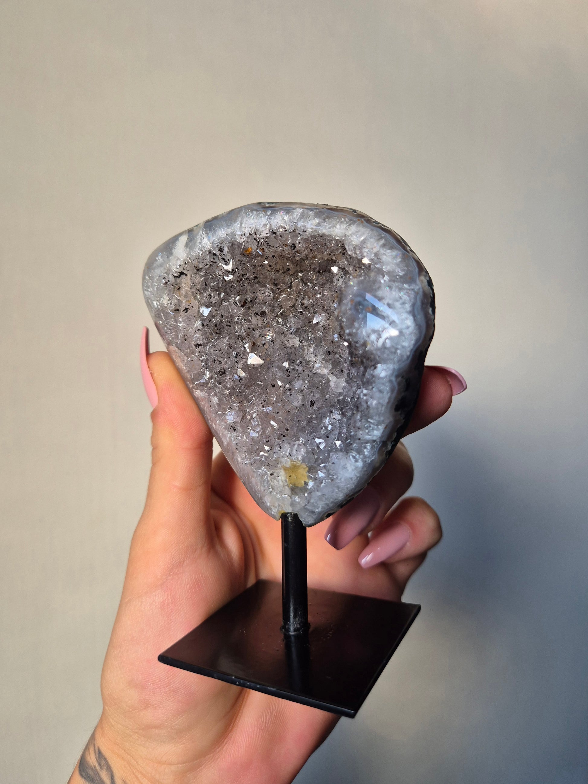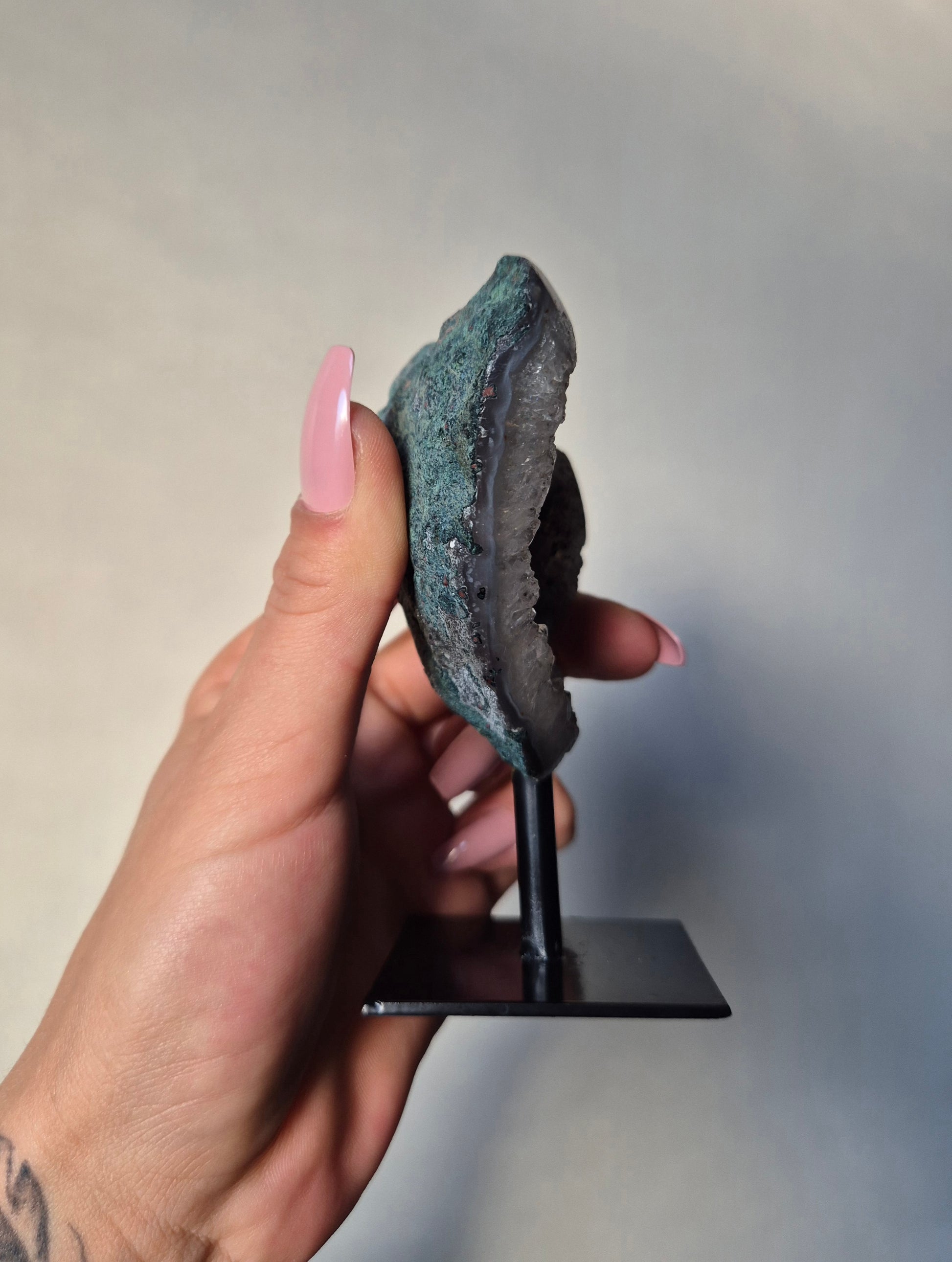 Het proces begint met het zorgvuldig selecteren van een hoogwaardige agaatschijf uit Brazilië. Daarna wordt de steen met de hand geslepen en gepolijst om de natuurlijke tekening en kristalstructuur optimaal tot zijn recht te laten komen. Vervolgens wordt de agaat bevestigd op een stevige metalen standaard, zodat hij op een elegante en stabiele manier kan worden gepresenteerd – perfect als blikvanger in elk interieur.