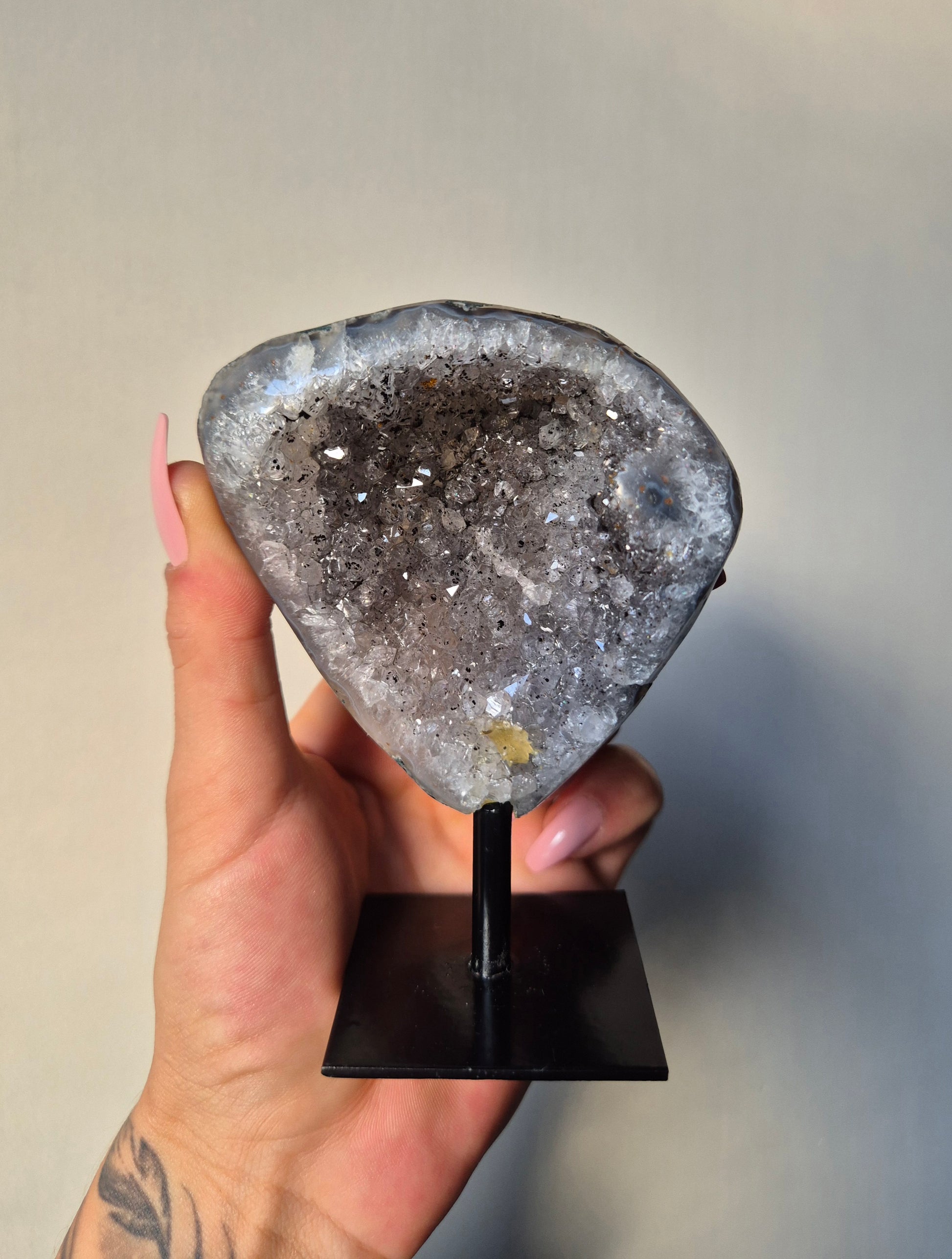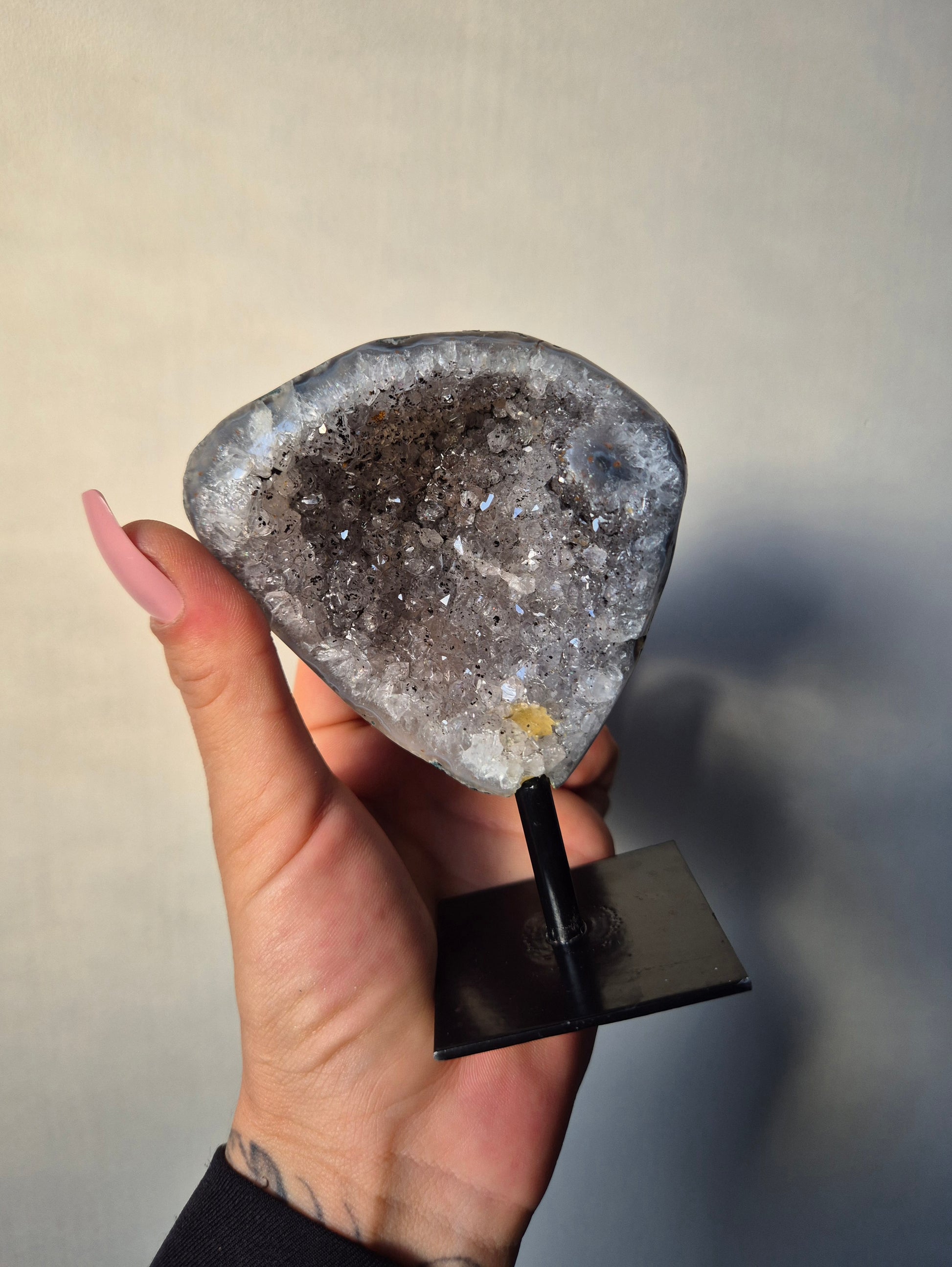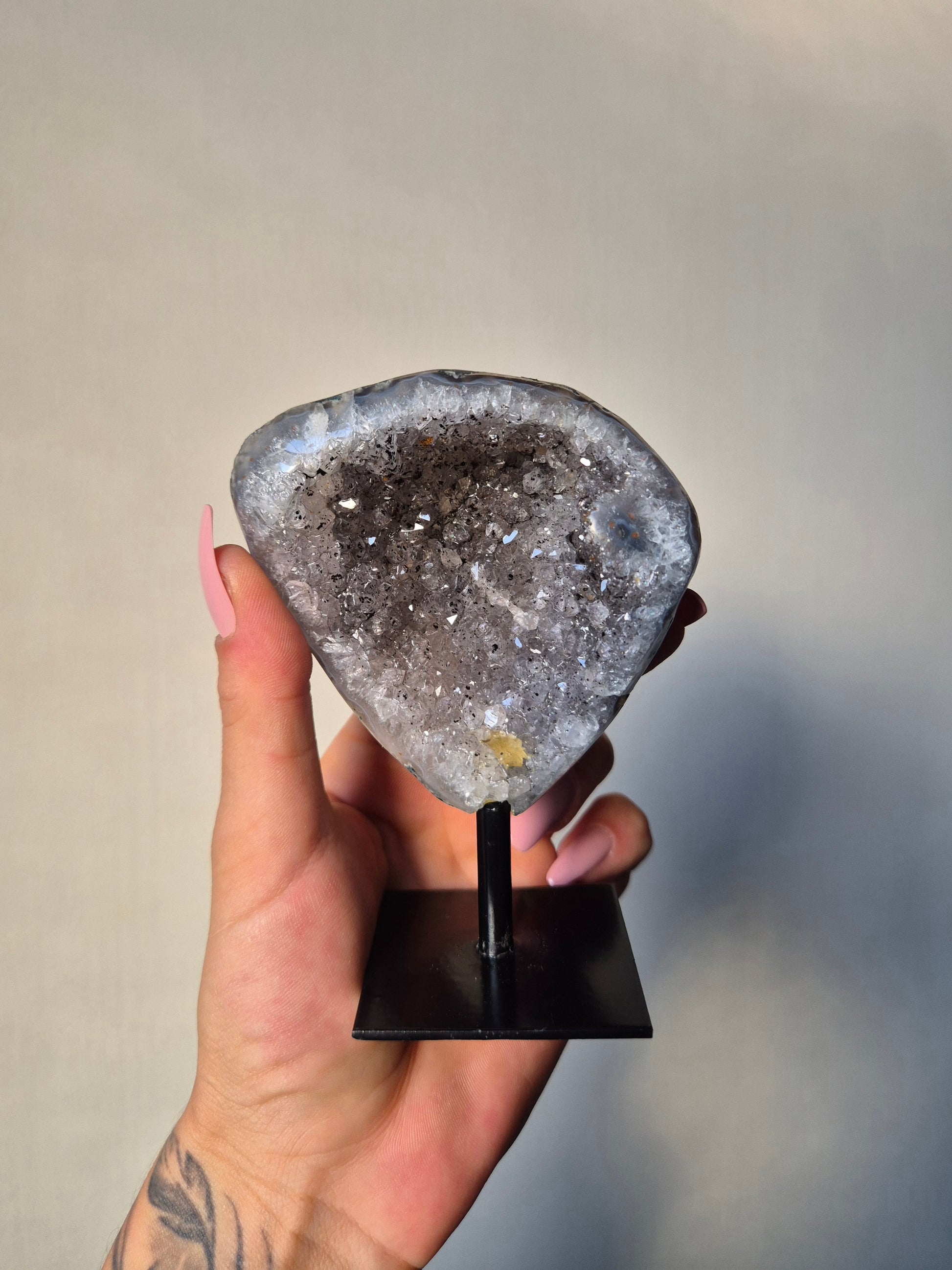 Het proces begint met het zorgvuldig selecteren van een hoogwaardige agaatschijf uit Brazilië. Daarna wordt de steen met de hand geslepen en gepolijst om de natuurlijke tekening en kristalstructuur optimaal tot zijn recht te laten komen. Vervolgens wordt de agaat bevestigd op een stevige metalen standaard, zodat hij op een elegante en stabiele manier kan worden gepresenteerd – perfect als blikvanger in elk interieur.