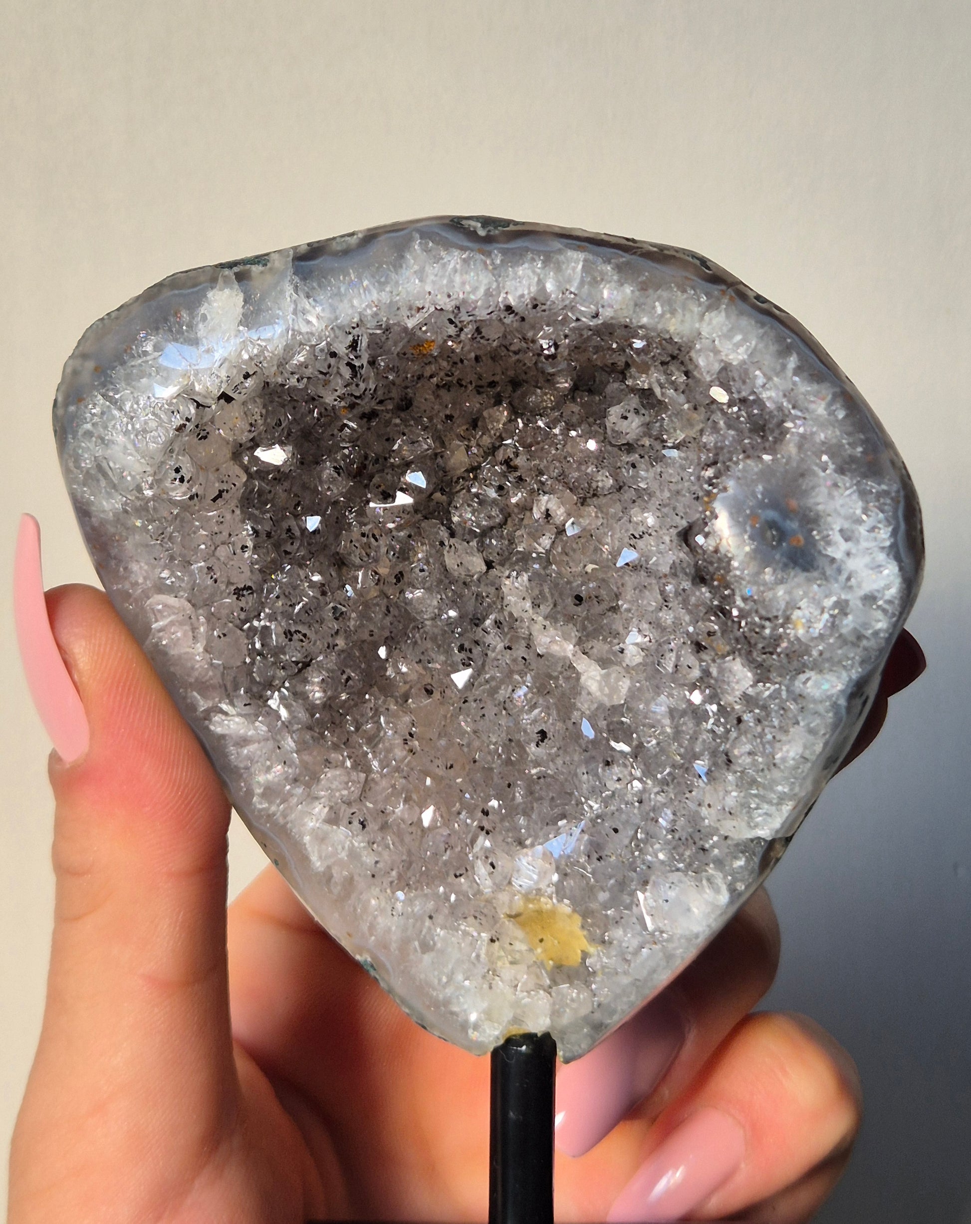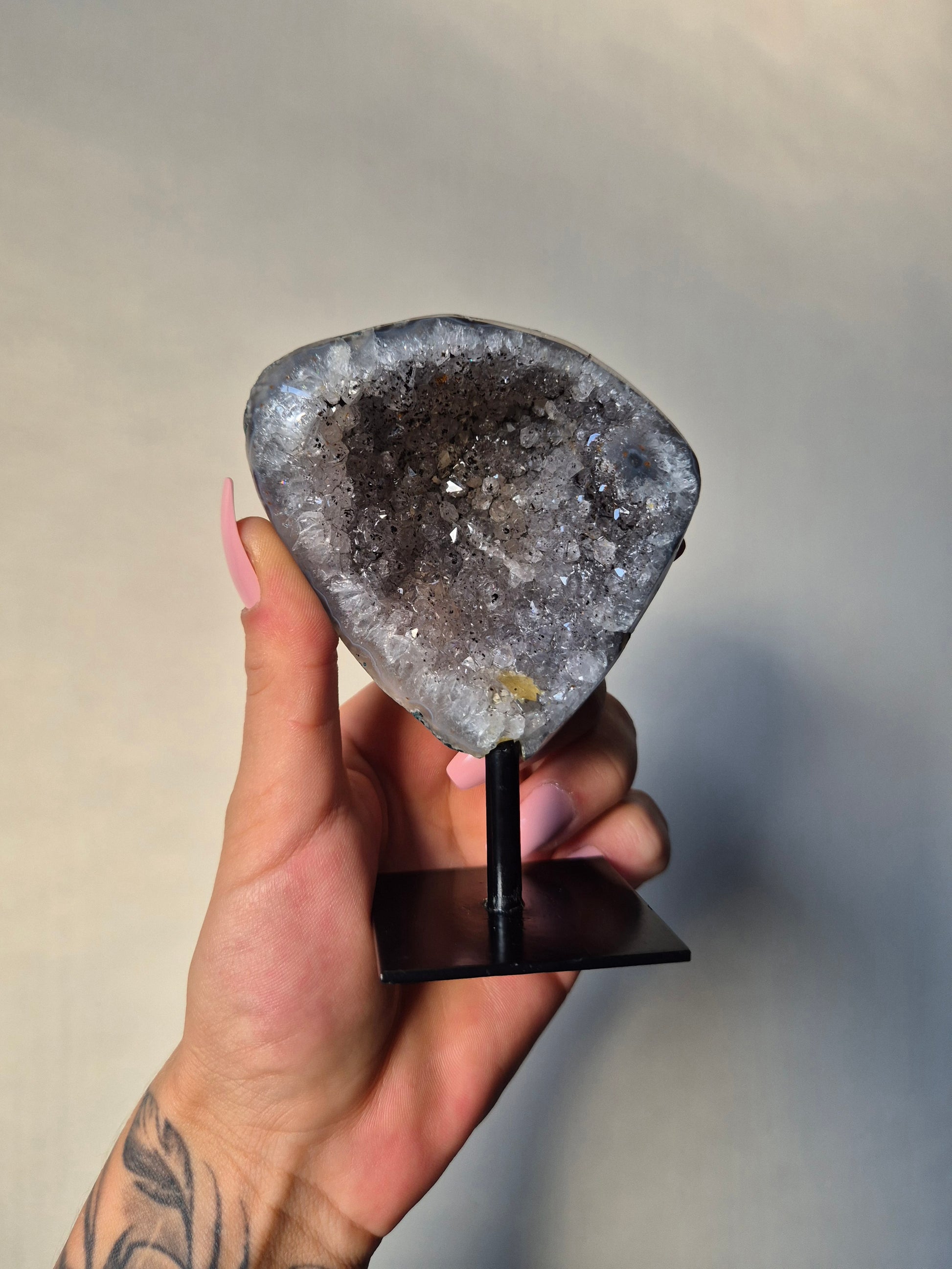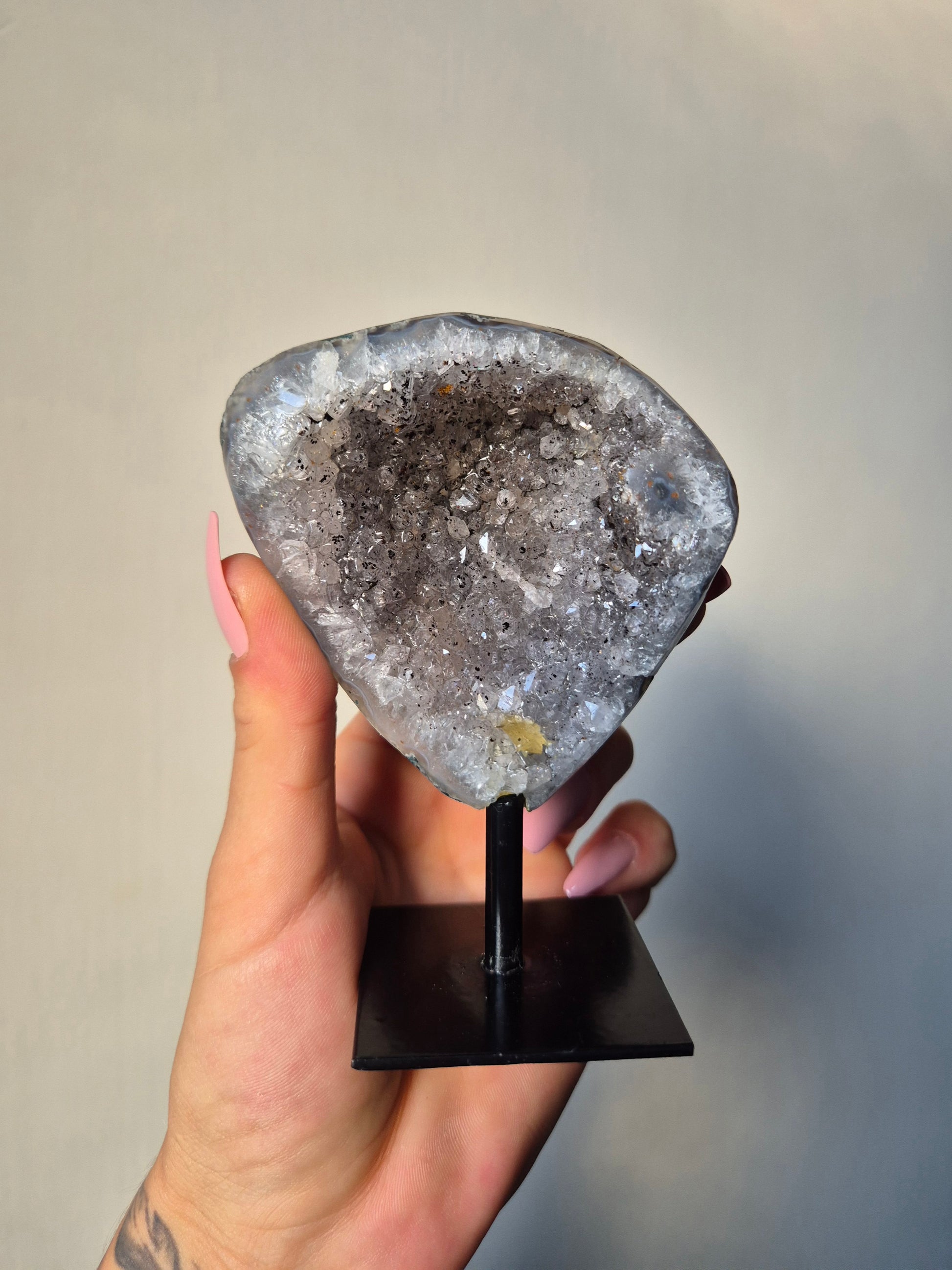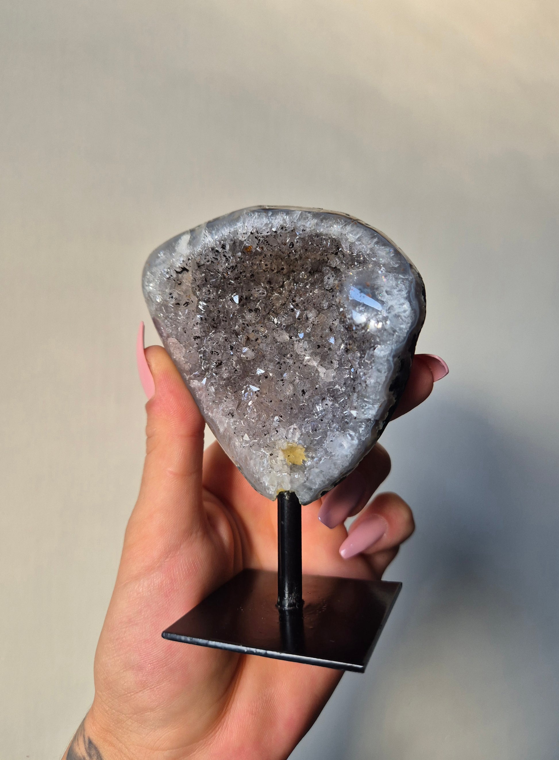 Het proces begint met het zorgvuldig selecteren van een hoogwaardige agaatschijf uit Brazilië. Daarna wordt de steen met de hand geslepen en gepolijst om de natuurlijke tekening en kristalstructuur optimaal tot zijn recht te laten komen. Vervolgens wordt de agaat bevestigd op een stevige metalen standaard, zodat hij op een elegante en stabiele manier kan worden gepresenteerd – perfect als blikvanger in elk interieur.