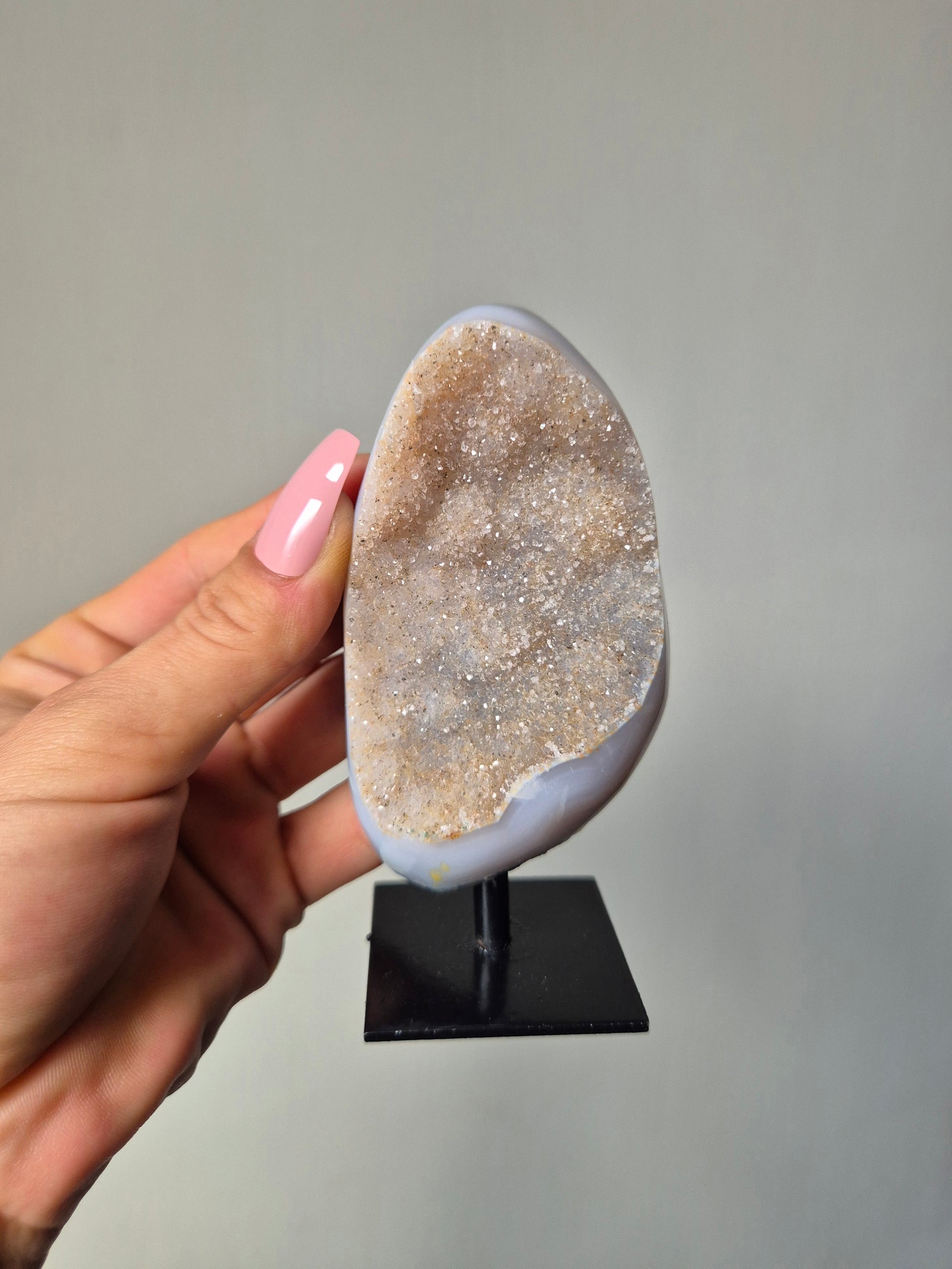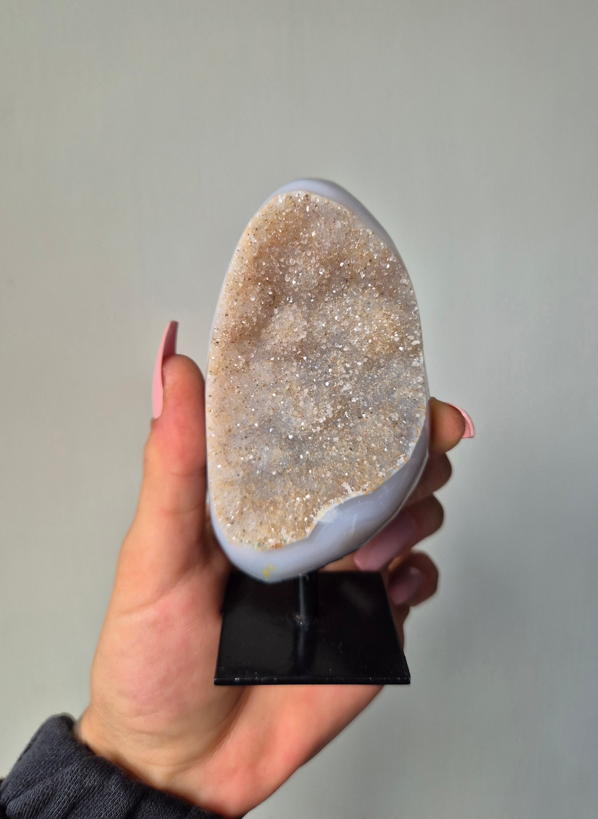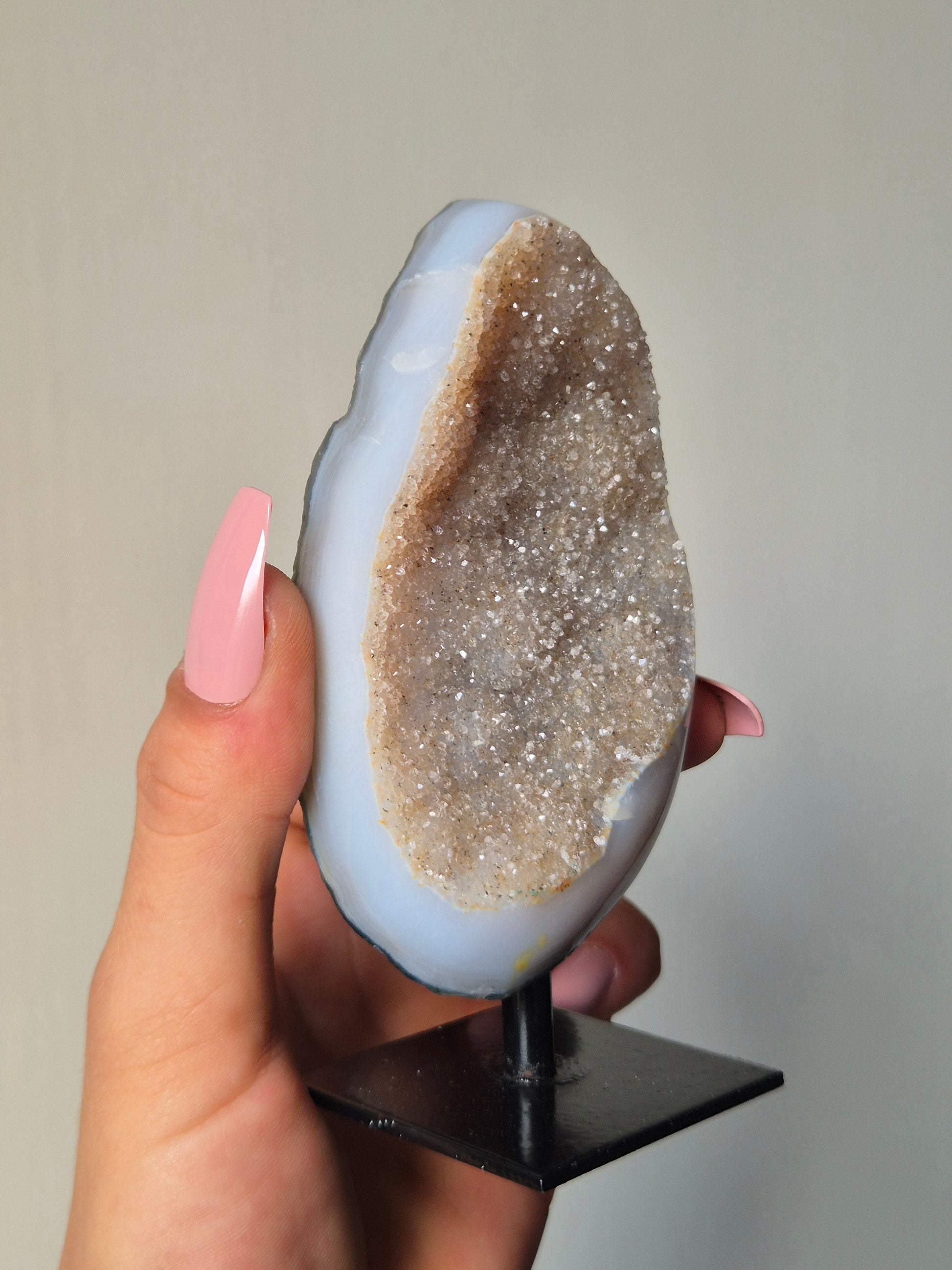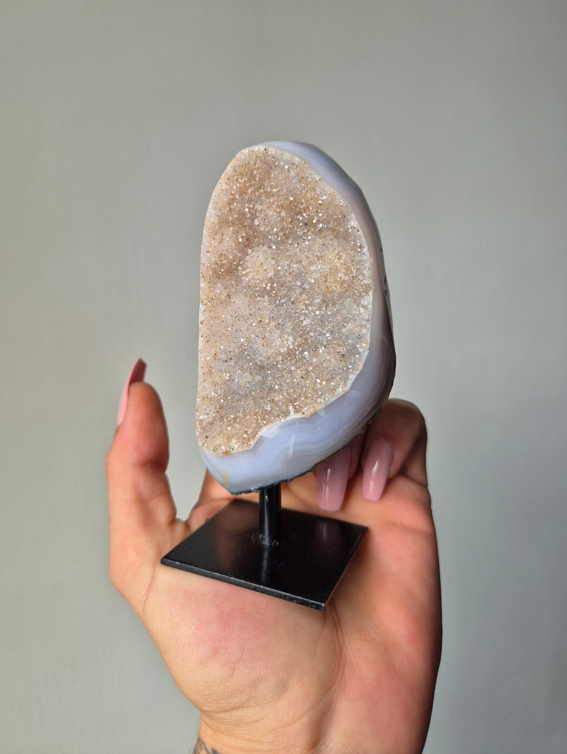 Het proces begint met het zorgvuldig selecteren van een hoogwaardige agaatschijf uit Brazilië. Daarna wordt de steen met de hand geslepen en gepolijst om de natuurlijke tekening en kristalstructuur optimaal tot zijn recht te laten komen. Vervolgens wordt de agaat bevestigd op een stevige metalen standaard, zodat hij op een elegante en stabiele manier kan worden gepresenteerd – perfect als blikvanger in elk interieur.