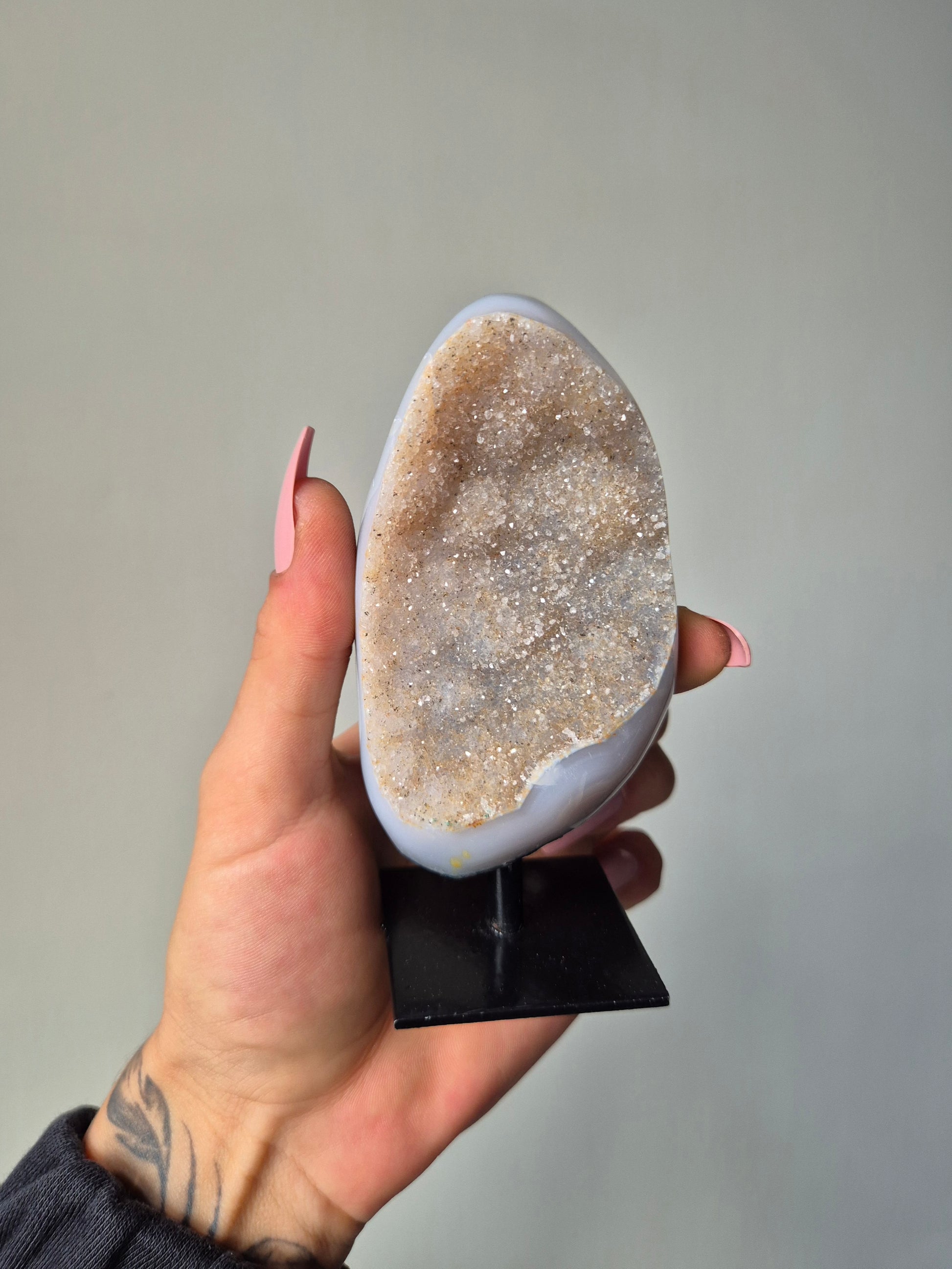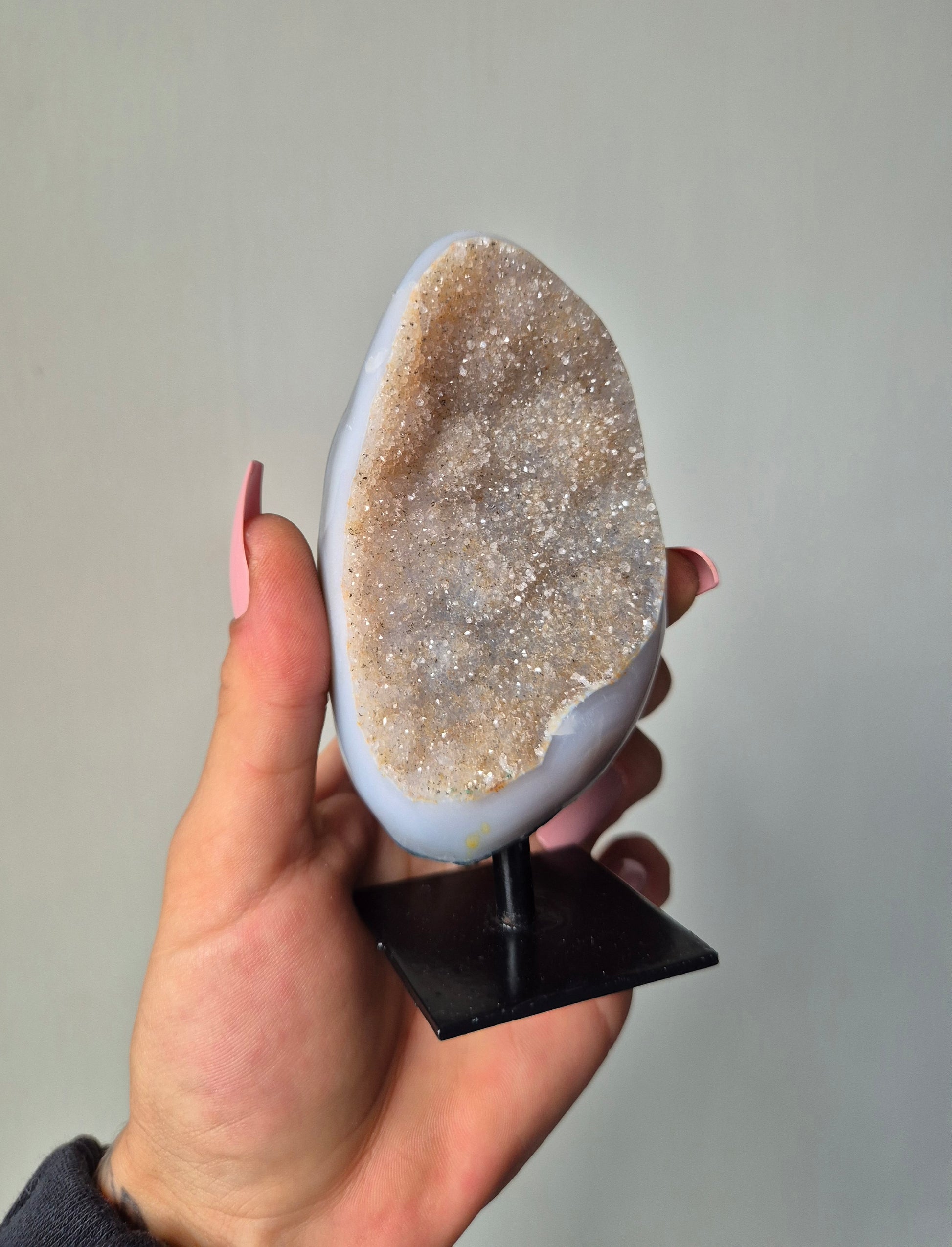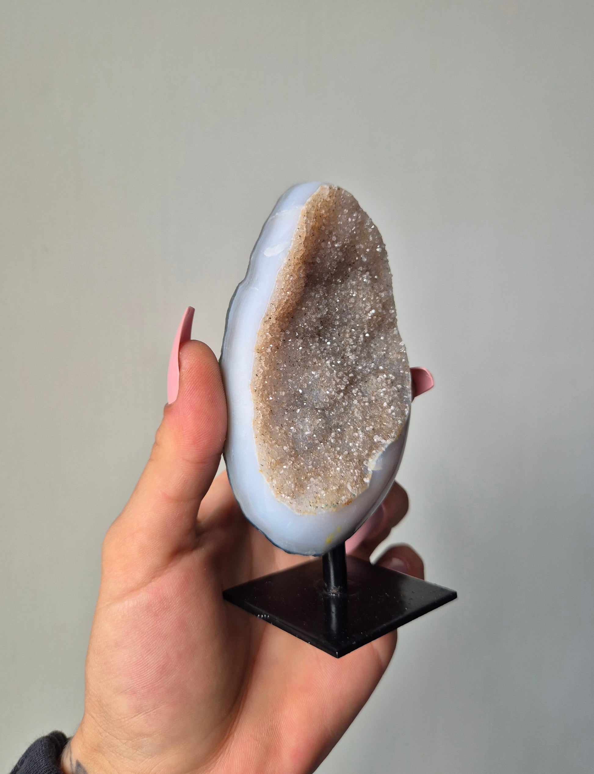 Het proces begint met het zorgvuldig selecteren van een hoogwaardige agaatschijf uit Brazilië. Daarna wordt de steen met de hand geslepen en gepolijst om de natuurlijke tekening en kristalstructuur optimaal tot zijn recht te laten komen. Vervolgens wordt de agaat bevestigd op een stevige metalen standaard, zodat hij op een elegante en stabiele manier kan worden gepresenteerd – perfect als blikvanger in elk interieur.