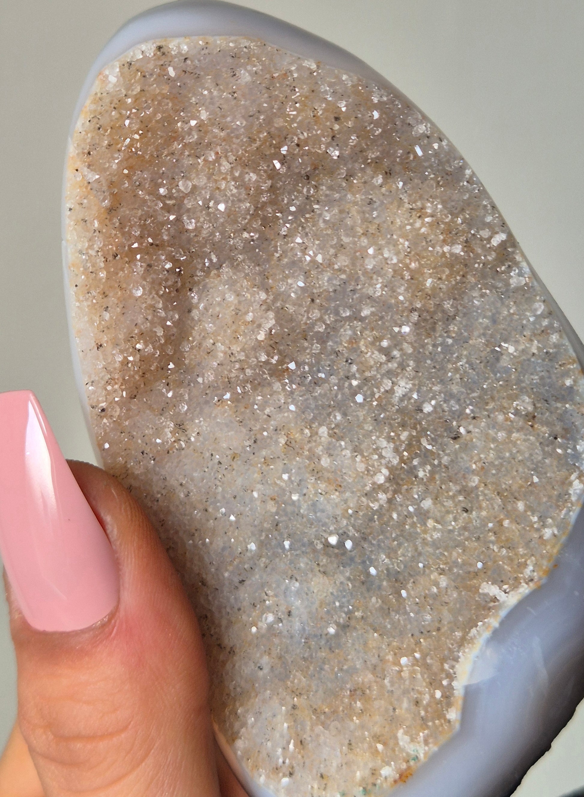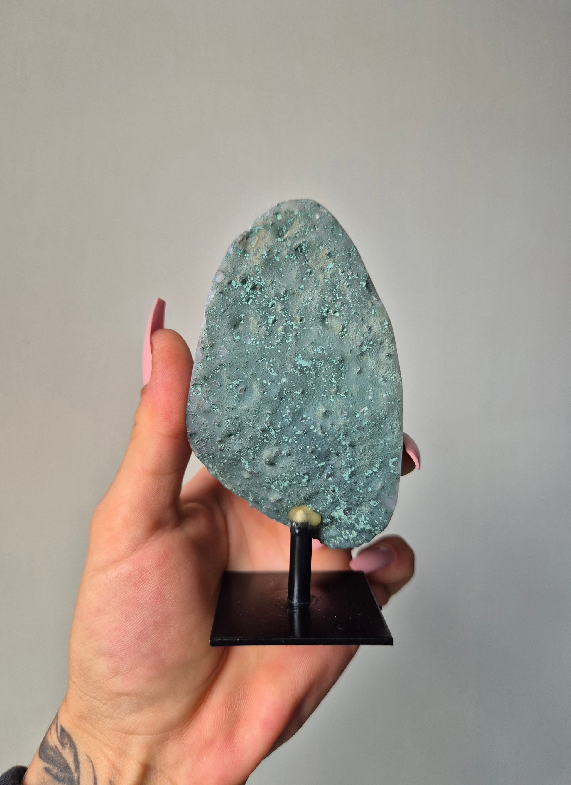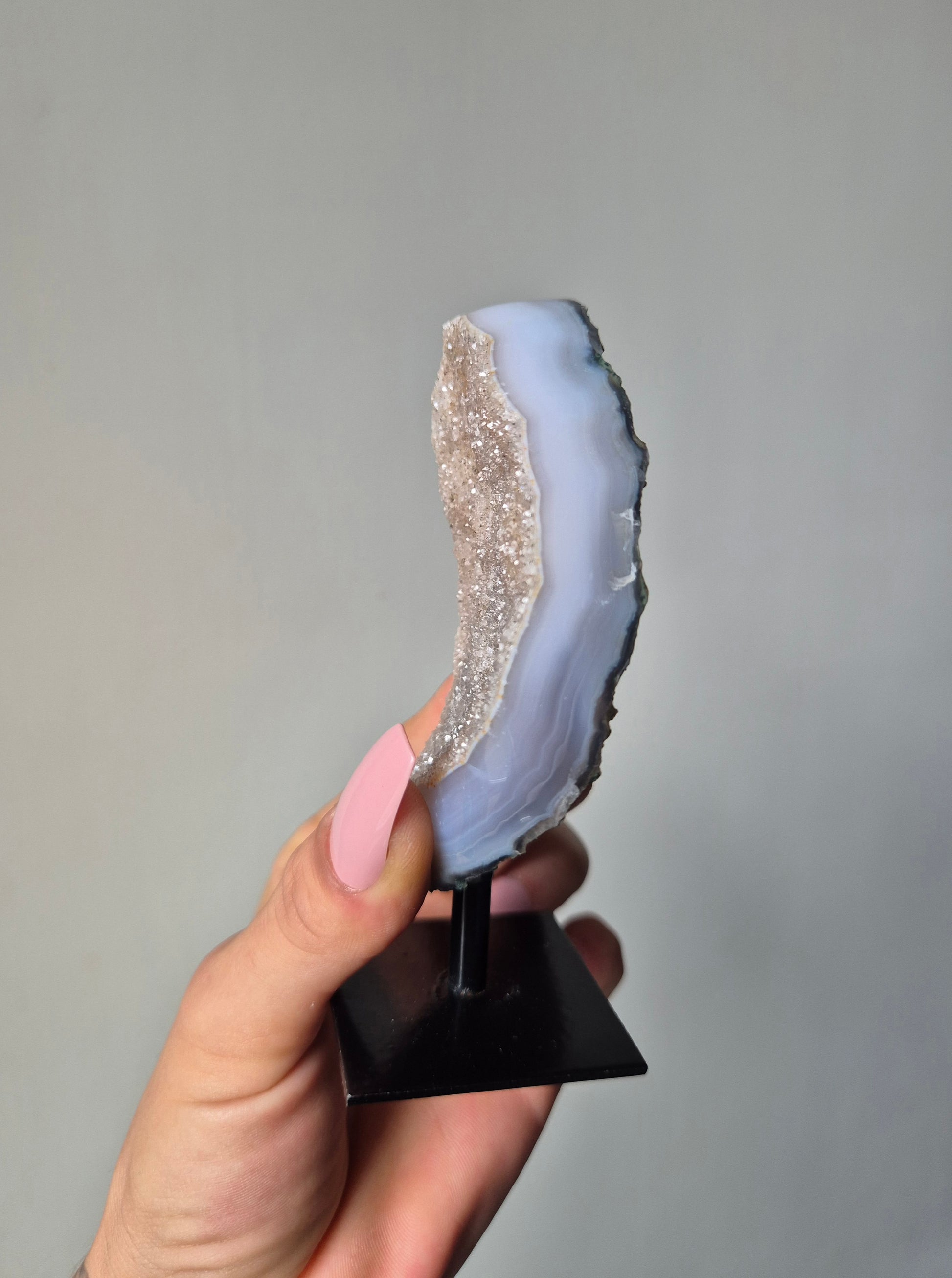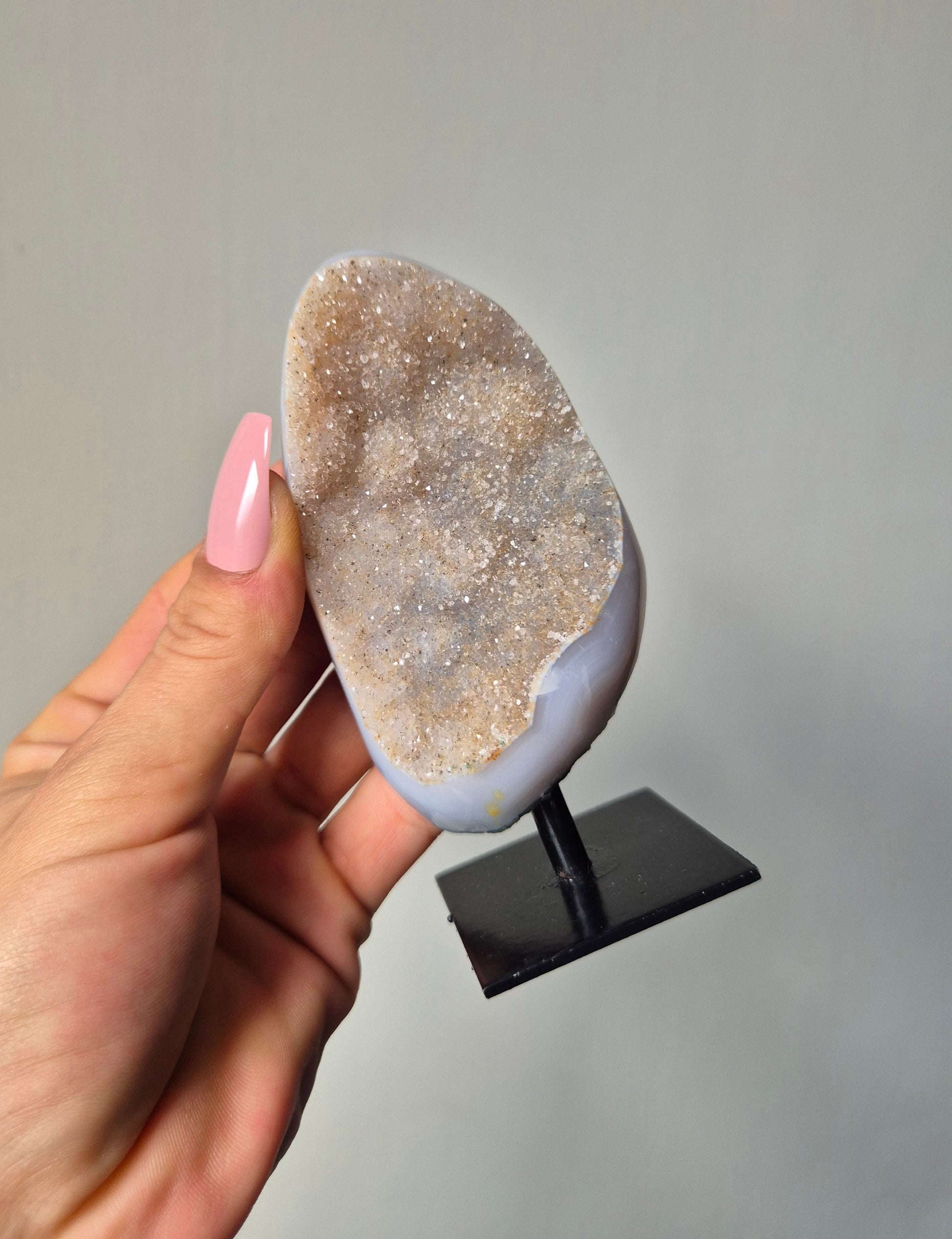 Het proces begint met het zorgvuldig selecteren van een hoogwaardige agaatschijf uit Brazilië. Daarna wordt de steen met de hand geslepen en gepolijst om de natuurlijke tekening en kristalstructuur optimaal tot zijn recht te laten komen. Vervolgens wordt de agaat bevestigd op een stevige metalen standaard, zodat hij op een elegante en stabiele manier kan worden gepresenteerd – perfect als blikvanger in elk interieur.