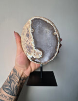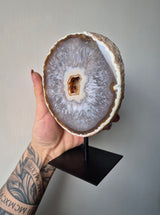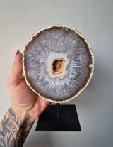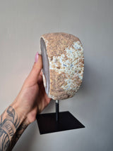 Deze prachtige Agaat op metalen standaard is een echte eyecatcher in jouw interieur. Agaat is een unieke kristalsoort die bekend staat om haar mooie kleuren en unieke uitstraling. Met deze Agaat op metalen standaard haal je niet alleen een mooi decoratiestuk in huis, maar ook een bijzonder stukje natuur. Zet deze Agaat op standaard in een vakkenkast, op tafel of in je slaapkamer en geniet van de mooie kleuren en de unieke uitstraling van deze bijzondere steen.